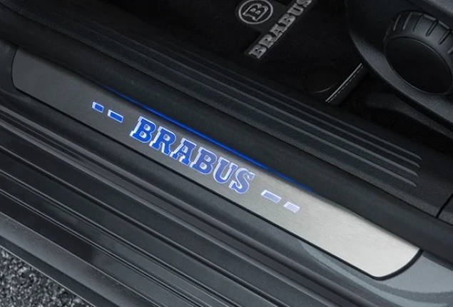 Stainless-steel scuff plates with LED-illuminated BRABUS logo. Features interchangeable ambient lighting in up to 64 colours. Mounted on high-grade plastic supports. Available in a two-piece set.