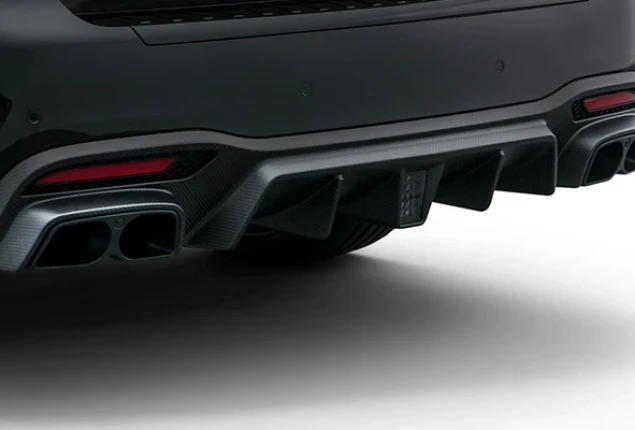 The rear skirt – designed like a classic motor racing diffuser. Replaces the original rear fascia insert. Made from high-grade carbon fibre.