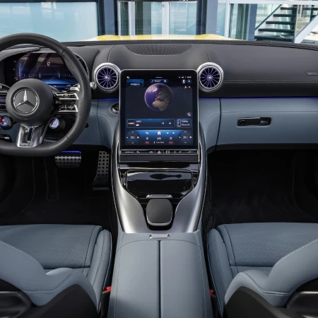 The moment you step in, you'll be filled with the exhilarating sensation of driving a one-of-a-kind sports car. The materials, colors, and design merge seamlessly, embodying the signature AMG DNA that exudes sportiness and exclusivity. From the AMG Performance steering wheel, to the digital operating and display system with AMG-specific content, and the AMG Performance seats with luxurious nappa leather upholstery, every detail is pure inspiration.